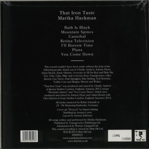 | Marika Hackman That Iron Taste - Blue Vinyl + Sealed UK vinyl LP album (LP record) | | Tracklisting / Additional Info: | Side One: 1. Bath Is Black 2. Mountain Spines 3. Cannibal Side Two: 4. Retina Television 5. I'll Borrow Time 6. Plans 7. You Come Down | | Condition : | Factory sealed from new. This item is unplayed. Click here for more info. | | Availability: | Sold Out - 'Request Next' to get an email if it comes back into stock. | | Year of Release: | 2013 | | Artist: | Marika Hackman (click here for complete listing) | | Title: | That Iron Taste - Blue Vinyl + Sealed (click here for more of the same title) | | Postage/Shipping: | Add item to your basket for a postage/shipping quote | | Format: | vinyl LP album (LP record) | | Record Label: | Dirty Hit | | Catalogue No: | DH00031 | | Country of Origin: | UK | | Language: | Regardless of country of origin all tracks are sung in English, unless otherwise stated in our description. | | Date of Release: | Unconfirmed | | Additional info: | Deleted